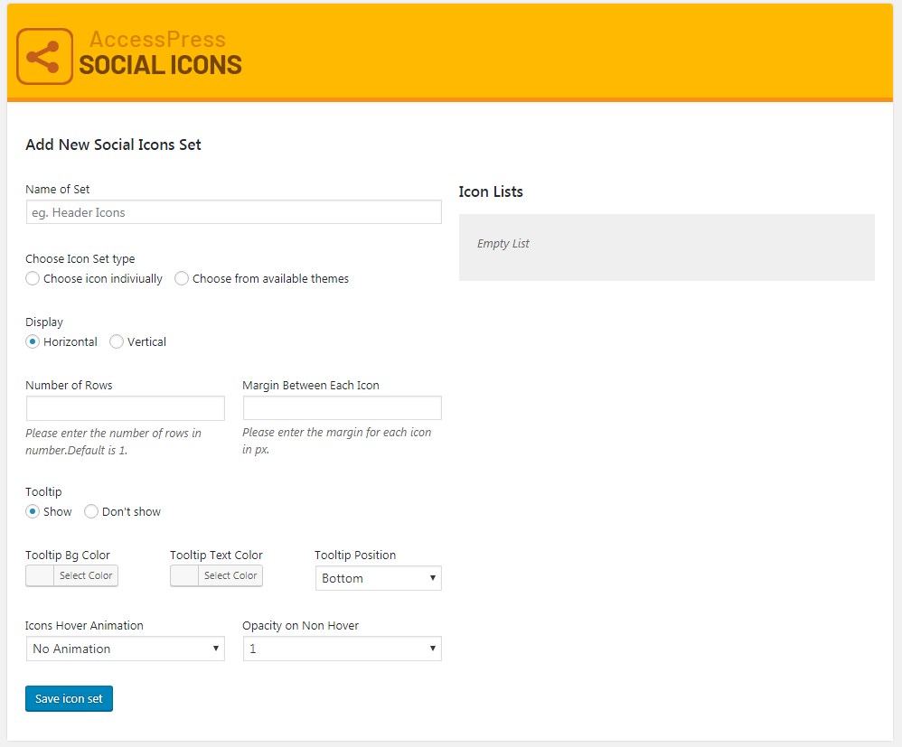 You can select icons from our 12 different beautifully designed sets, or upload our own icons set, customize them, define sizes, add several effects, add tooltip, set margins etc. Also you can define to appear the icons horizontally/vertically and no. of rows/columns!