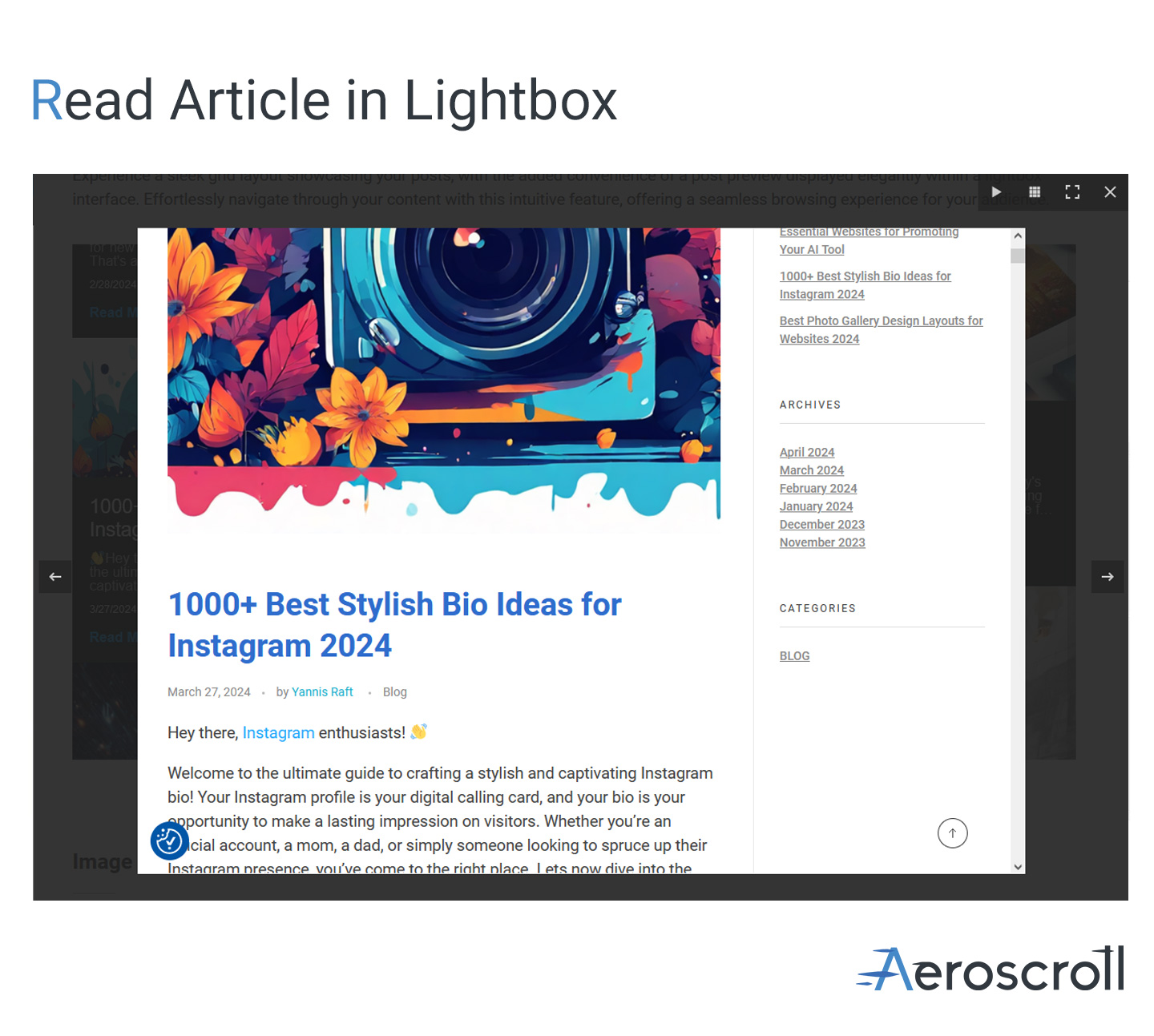 Yes, you can integrate the Aeroscroll Gallery plugin with your blog, making it a great way to display your blog posts in a visually appealing manner. The plugin provides a user-friendly option to include images from your posts in your photo gallery. This feature allows you to create engaging galleries that pull content directly from your blog posts to create a post grid, enhancing the overall visual appeal of your website. Additionally, in the PRO version, each blog post can be set to open inside the Lightbox, offering a seamless reading experience within your image gallery.