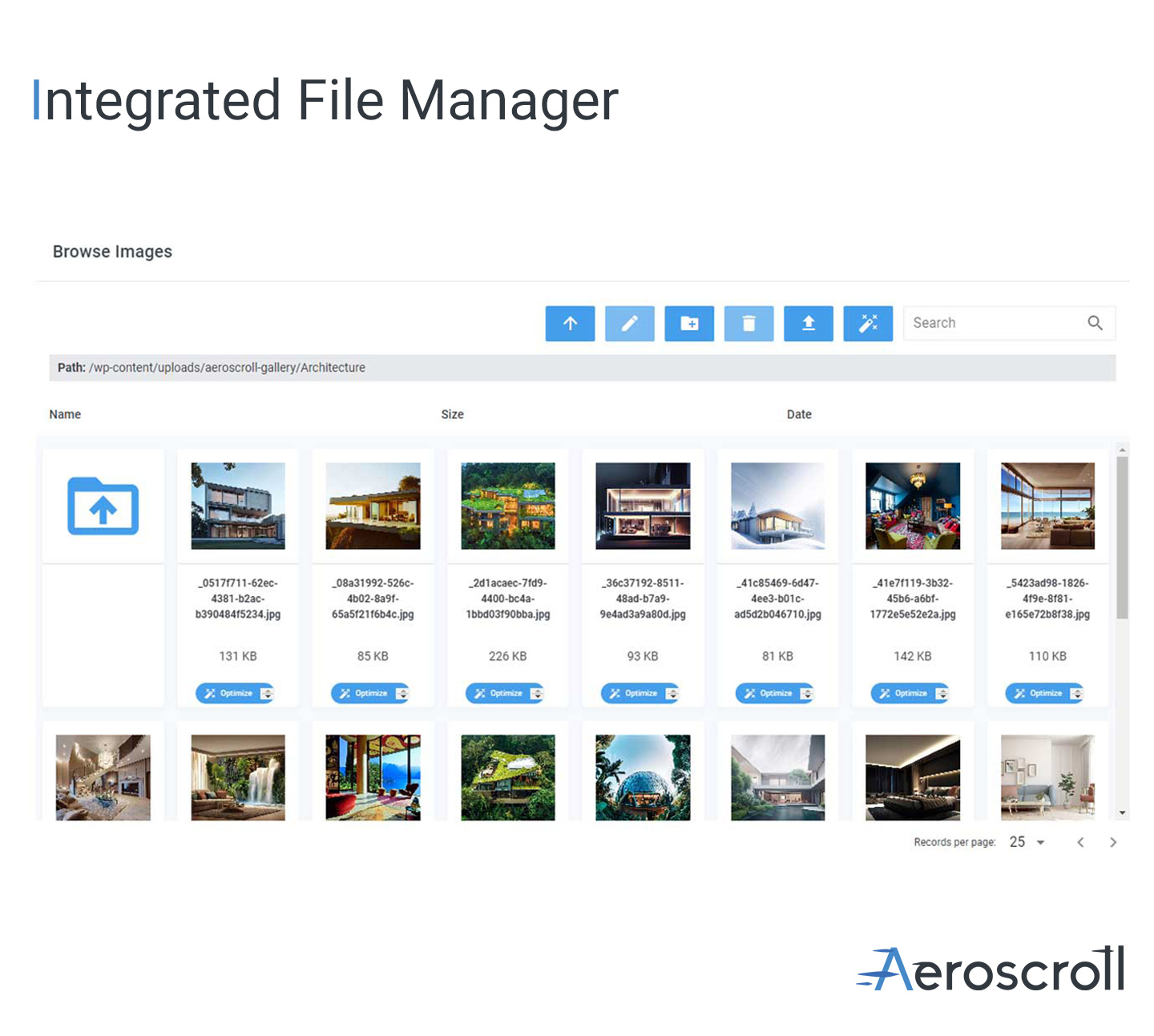 Aeroscroll Gallery includes an integrated file manager that makes it easy to manage your image assets for your galleries. You can upload, organize, and manage your images directly within the plugin, simplifying the process of maintaining your image gallery blocks and post grid.