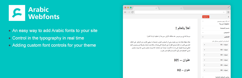An easy way to add Arabic fonts to any theme without coding using WordPress Customizer.[youtube https://www.youtube.com/watch?v=MoAGLEywBgg] Arabic Webfonts Site | Jozoor Plugins | Jozoor Themes An easy way to add Arabic fonts to any theme without coding using WordPress Customizer. This plugin integrates with the WordPress Customizer so you can preview all Arabic fonts on your site in realtime. It's compatible with any theme. It also allows you to create custom font controls in the plugin admin page area to control particular css selectors. Once created, these custom font controls are instantly available in the customizer no coding required! The plugin depend on " Arabic fonts library " from: fontface.me Arabic Webfonts Features