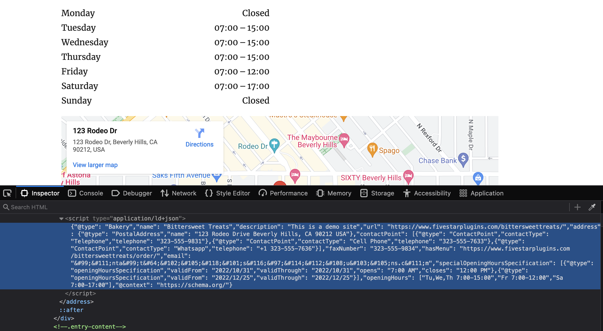 schema.org markup is added LD+JSON format. This helps search engines, like Google, discover your address, phone number and opening hours, so they can display them with your listing on Google.