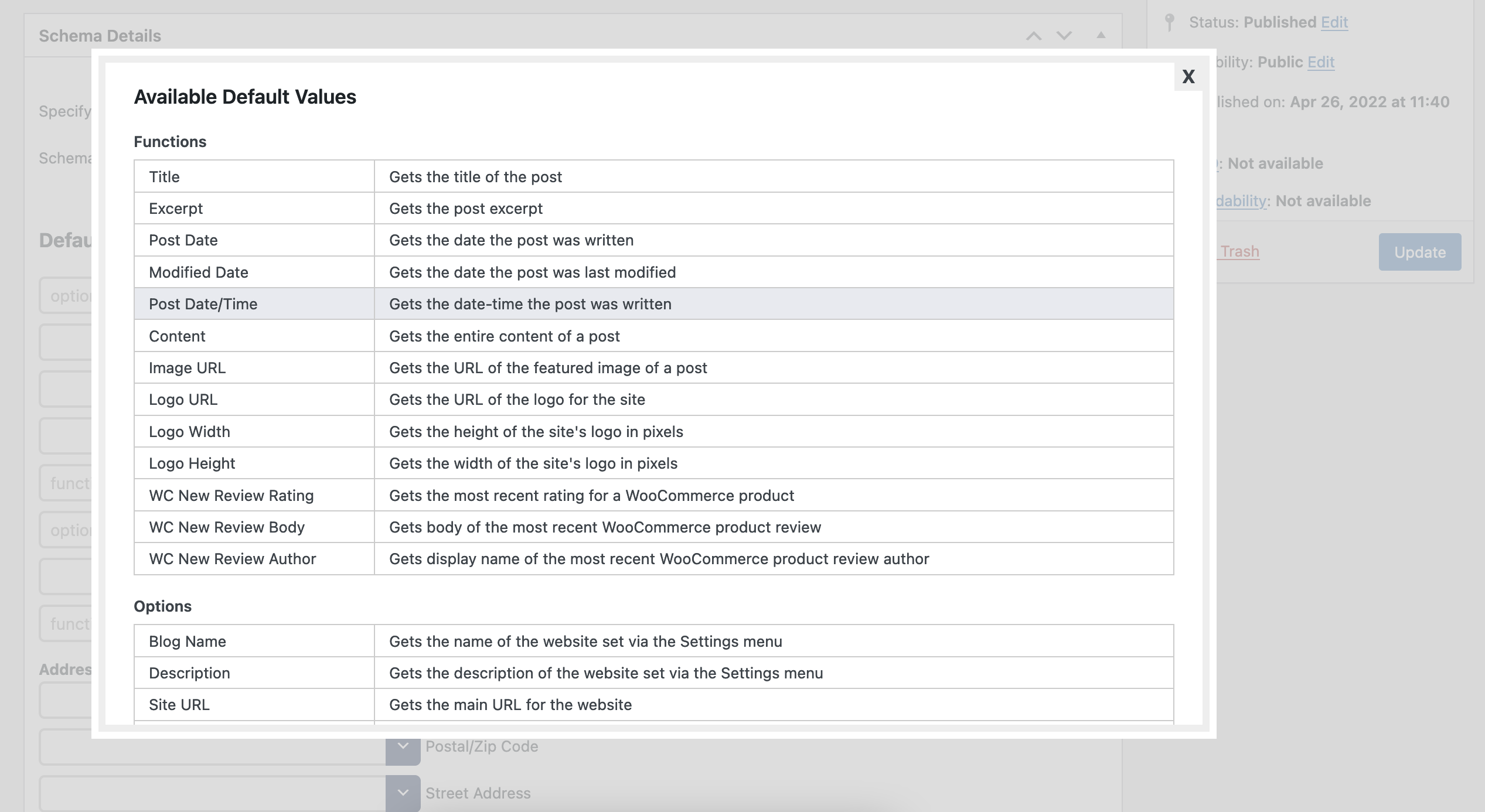 schema.org. When you add a schema element, you can fill in each of these properties with defaults that you want to apply to all posts/pages that have the schema. You can then customize each property directly on the post edit screen, should you need to make a change for a specific page or post.