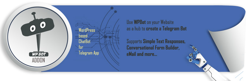 Download WordPress ChatBot WPBotThis ChatBot addon extends the WPBot plugin's functionality and adds the ability for WPBot to chat with the users on Telegram. Optionally this Telegram ChatBot uses dialogflow API: https://cloud.google.com/dialogflow/ However, user can enable or disable Dialogflow API from Chatbot settings. Terms of service: https://cloud.google.com/dialogflow/docs/terms-trial-edition The plugin can work well without connecting to DialogFlow utilizing all of the WPBot free version's features. ChatBot for Telegram Support, Bug Fix, Feature Request