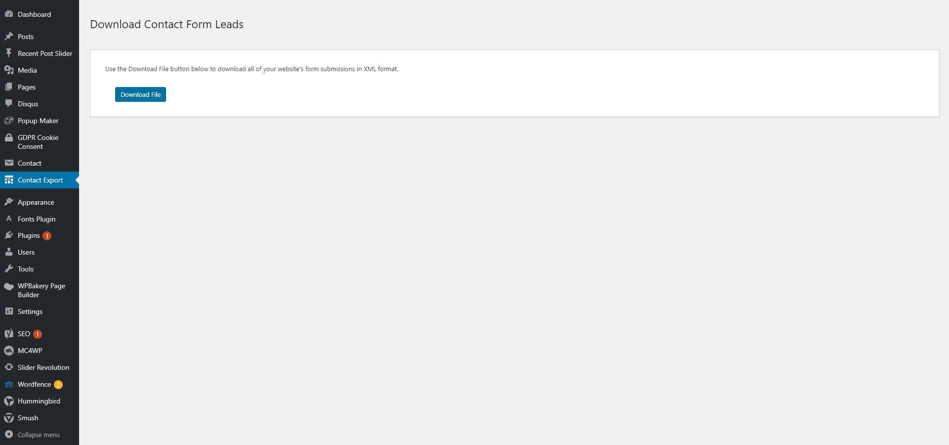 All Contact Form 7 form submissions submitted after this plugin's installation can be exported in XML format using the Download File button in wp-admin.