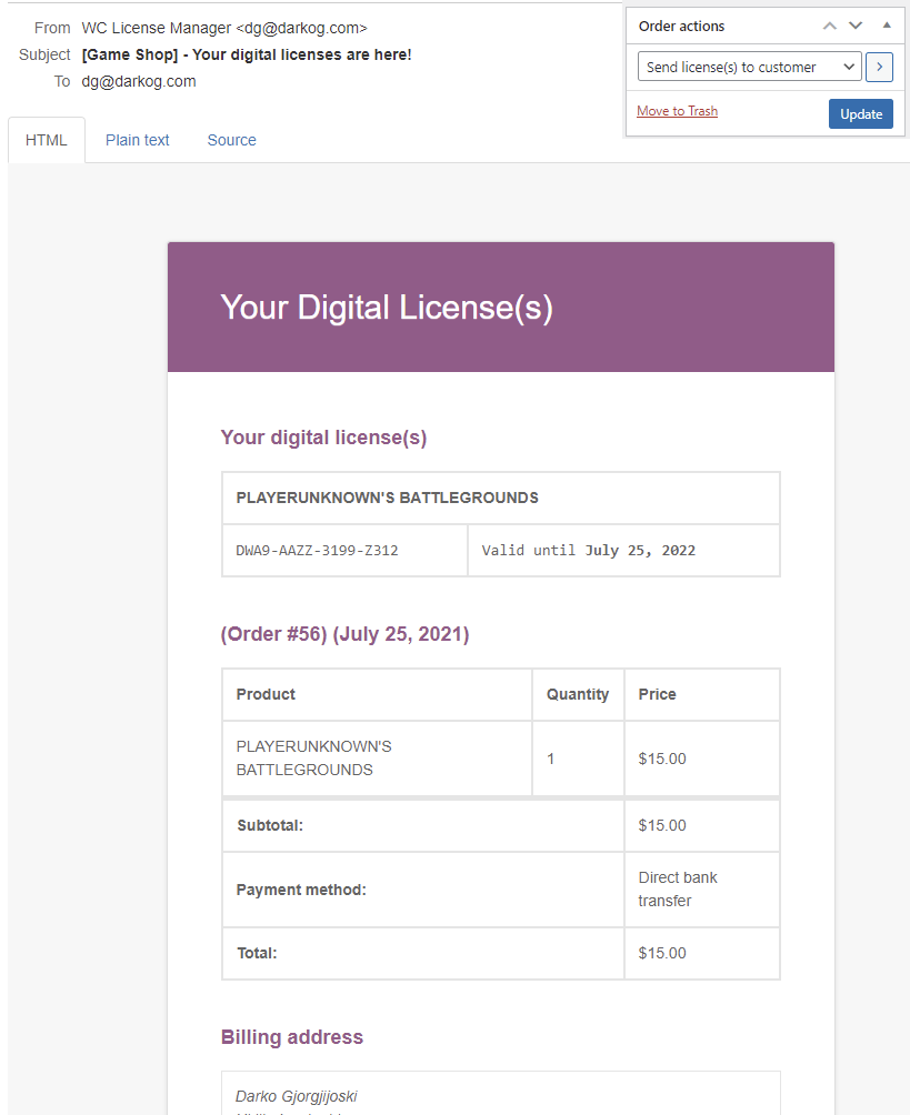 - Adds purchased License Keys in the Order Confirmation email (Read more)