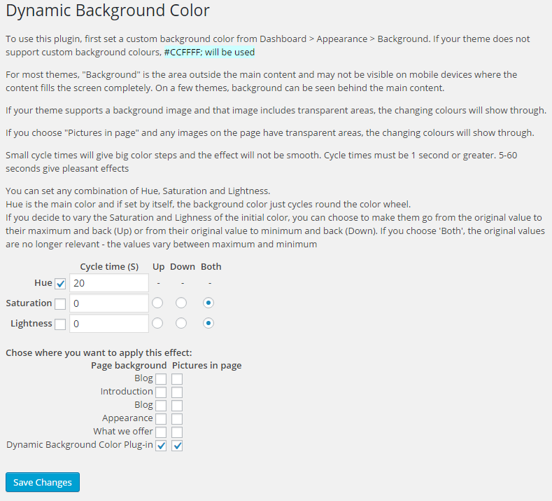 dynamic-background directory to the /wp-content/plugins/ directorySmall increments of H/S/L values give continuously varying colours. Small increments to R/G/B result in big jumps of colour.