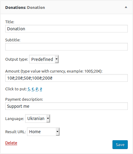 The plugin allows you add a form on the website to receive donations with a payment system LiqPay. The form can be added via the widget or shortcode [elp_donate]