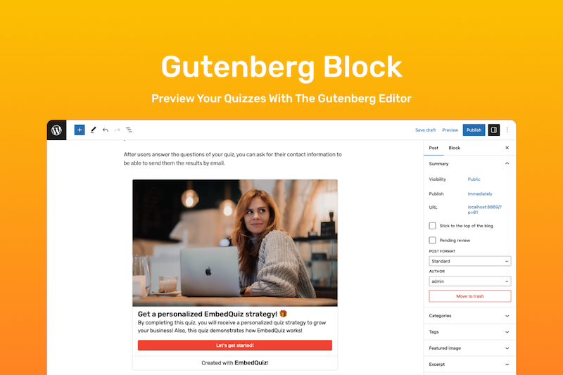 A new block will appear inside the Gutenberg editor, called EmbedQuiz. When you add this block to your website, you can select a quiz from