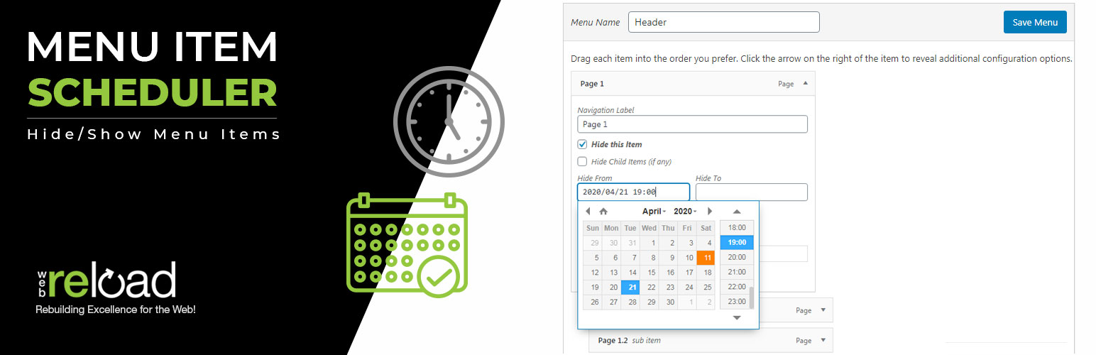 The Menu Item Scheduler plugin for menu items allow you to schedule wordpress menu items at given dates and times, user can specify that a menu item should appear/be visible or disappear/be invisible or redirect based on given time characteristics.
