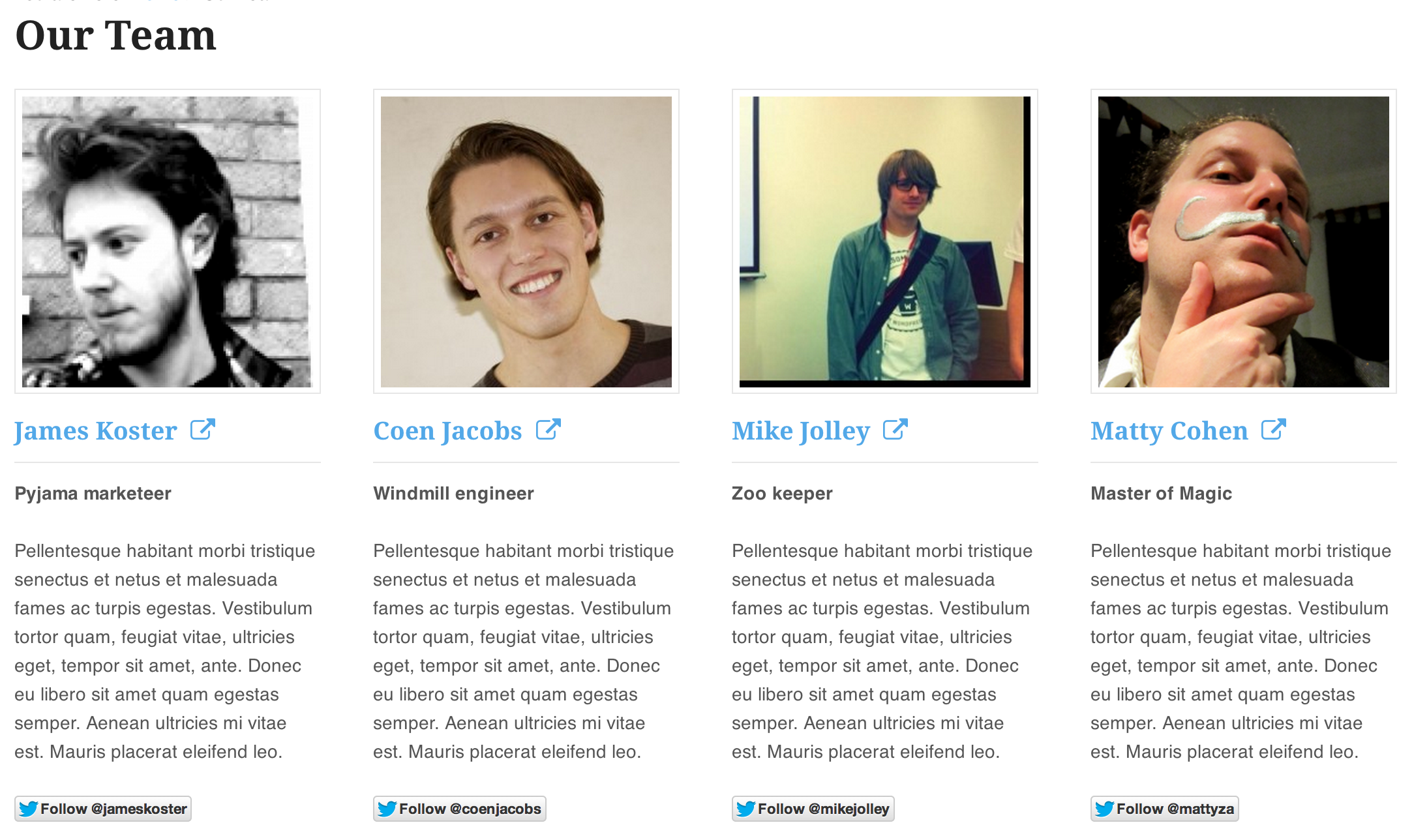 <?php do_action( 'woothemes_our_team' ); ?> in your templates, or use the provided widget or shortcode."Our Team by WooThemes" is a lean plugin that aims to keep it's purpose as clean and clear as possible. Thus, we don't load any preset CSS styling, to allow full control over the styling within your theme or child theme. If you simply want to apply layout (as displayed in the screenshots) you can do so with this snippet. Read more in the documentation.
