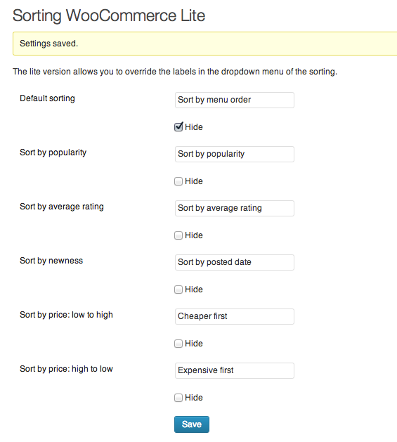 Sorting WooCommerce Lite edition allows you to change the labels of the sorting dropdown menu or hide the sorting menu completely.