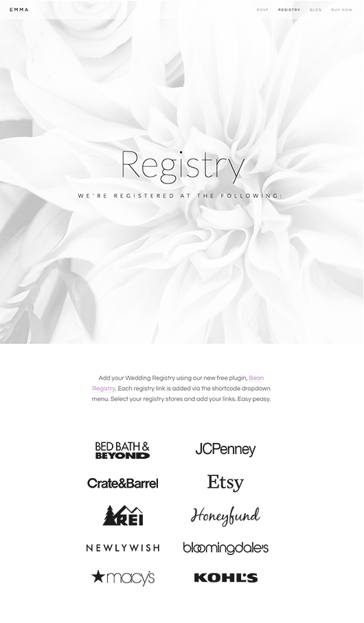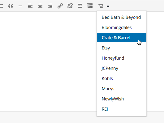 wedding-registry folder to your /wp-content/plugins/ directory or alternatively upload the wedding-registry.zip file via the plugin page of WordPress by clicking 'Add New' and selecting the zip from your local computer.You'll see a new button at the end of the default WordPress visual editor that states Insert Registry Shortcode when hovered. Select a registry location from the dropdown and insert your URL in the url="" shortcode parameter.