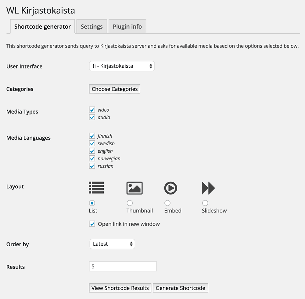 In WordPress admin, navigate to Tools > WL Kirjastokaista. Choose UI, categories, filters etc. and test shortcode results with pressing button View Shortcode Results. If you're satisfied with the results, press Generate Shortcode -button and copy paste the generated shortcode to WordPress content area of your choice.