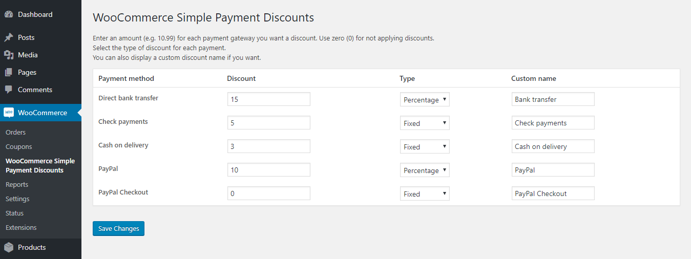 Activate plugin and you will have 'WooCommerce Simple Payment Discounts' settings link under WooCommerce tab. Set amount and discount type against payment method list.
