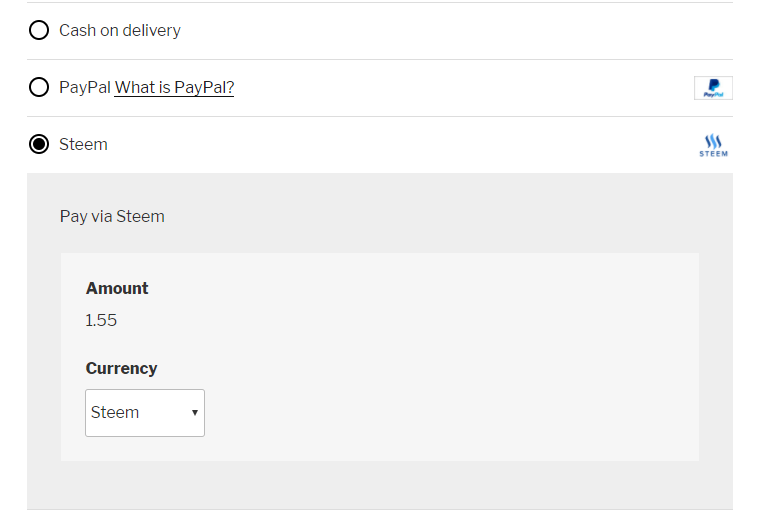 WooCommerce Steem lets you accept Steem payments directly to your WooCommerce shop (Currencies: STEEM, SBD).