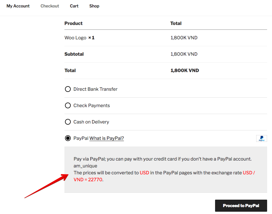 đ to anything, e.g: VND, VNĐ, đồng, etc.000 of prices to K (or anything). E.g: 50000 (VND) will be 50K (VND), or 50 thousand (VND).VND for the PayPal Standard gateway. Convert VND prices to any PayPal supported currency before sending visitors to the PayPal pages.VND for the PayPal Express Checkout gateway./wp-content/plugins/woo-viet directory, or install the plugin through the WordPress plugins screen directly.Plugins screen in WordPress.WooCommerce -> Woo Viet screen and configure the plugin./wp-content/plugins/woo-viet directory, or install the plugin through the WordPress plugins screen directly.WooCommerce -> Woo Viet screen and configure the plugin.