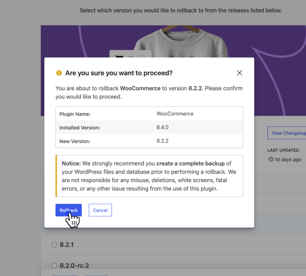 Important Disclaimer: This plugin is not intended to be used without first taking the proper precautions to ensure zero data loss or site downtime. Always be sure you have first tested the rollback on a staging or development site prior to using WP Rollback on a live site.